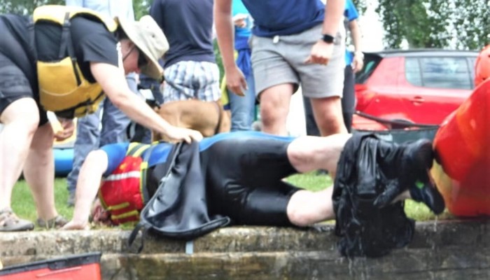 Back in our boat to paddle from the finish line to the marina, where we parked our cars. While getting back in the boats, Steve Jowett announced to the group that he was “Going over” and promptly capsized. Due to fatigue he required man handling to lift him back onto the shore with his shorts around his ankles.